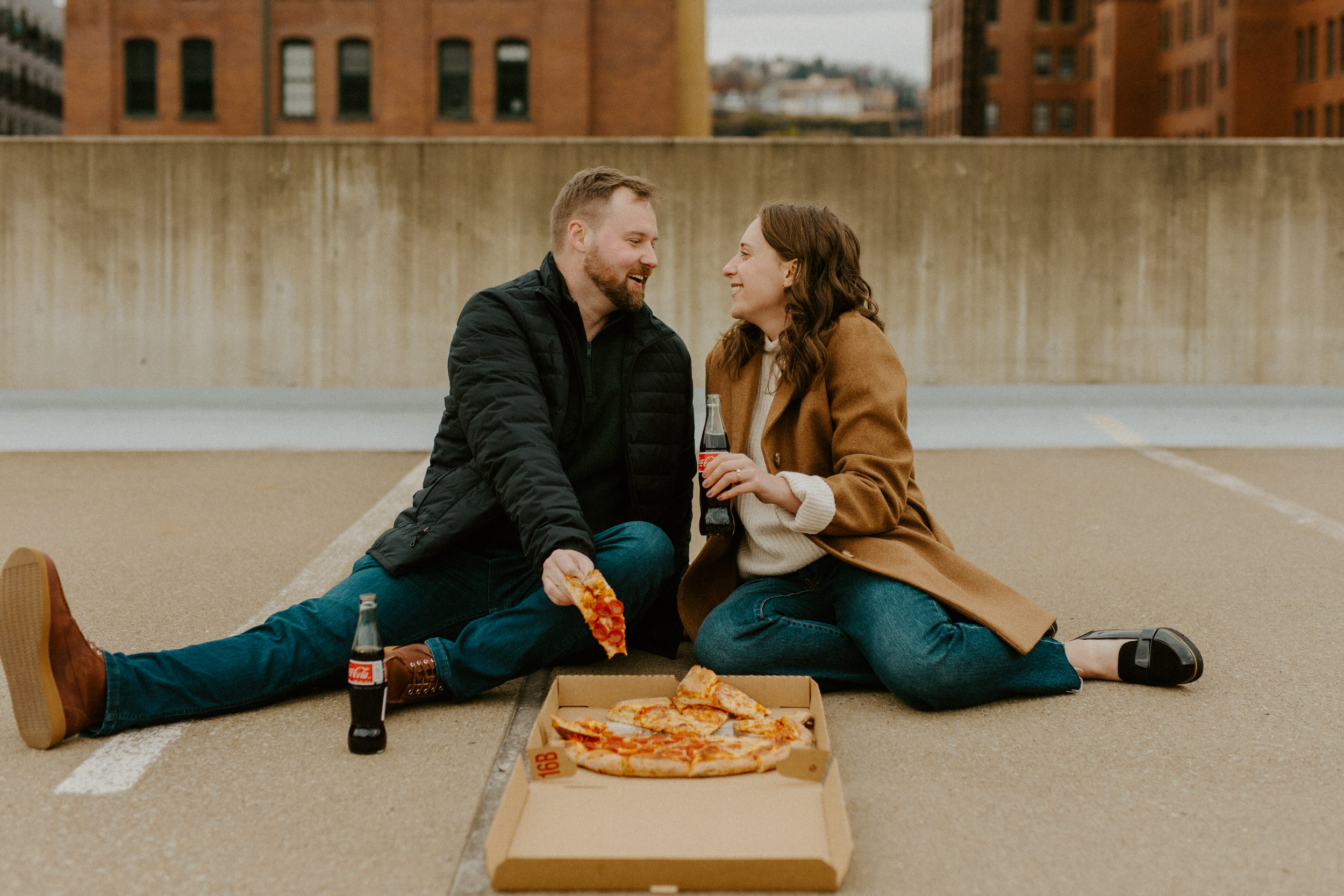 Rooftop pizza date engagement session in the Strip District of Pittsburgh.